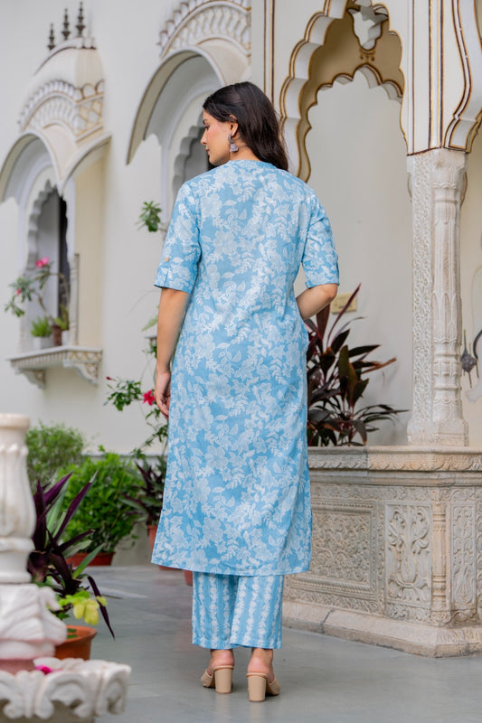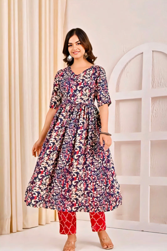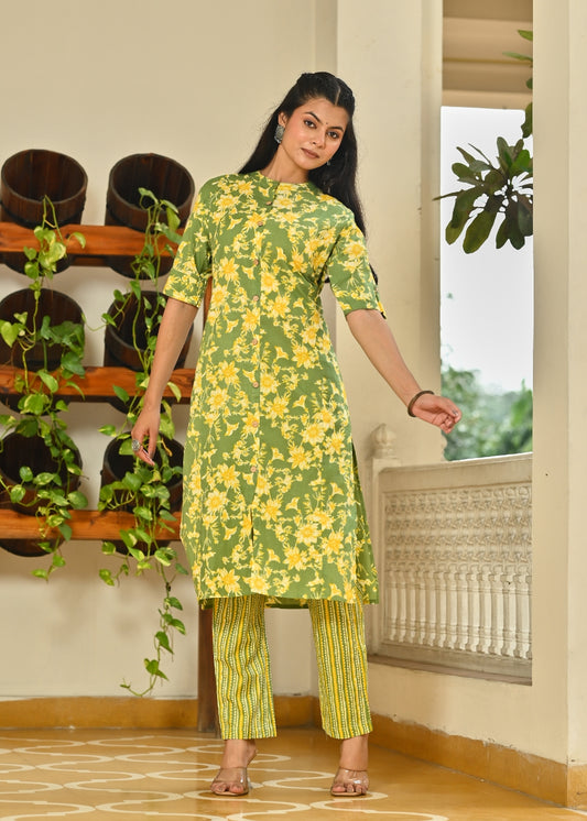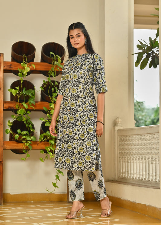 Pink Rayon Kurta Set with Gold Leaf Print & Solid Pants