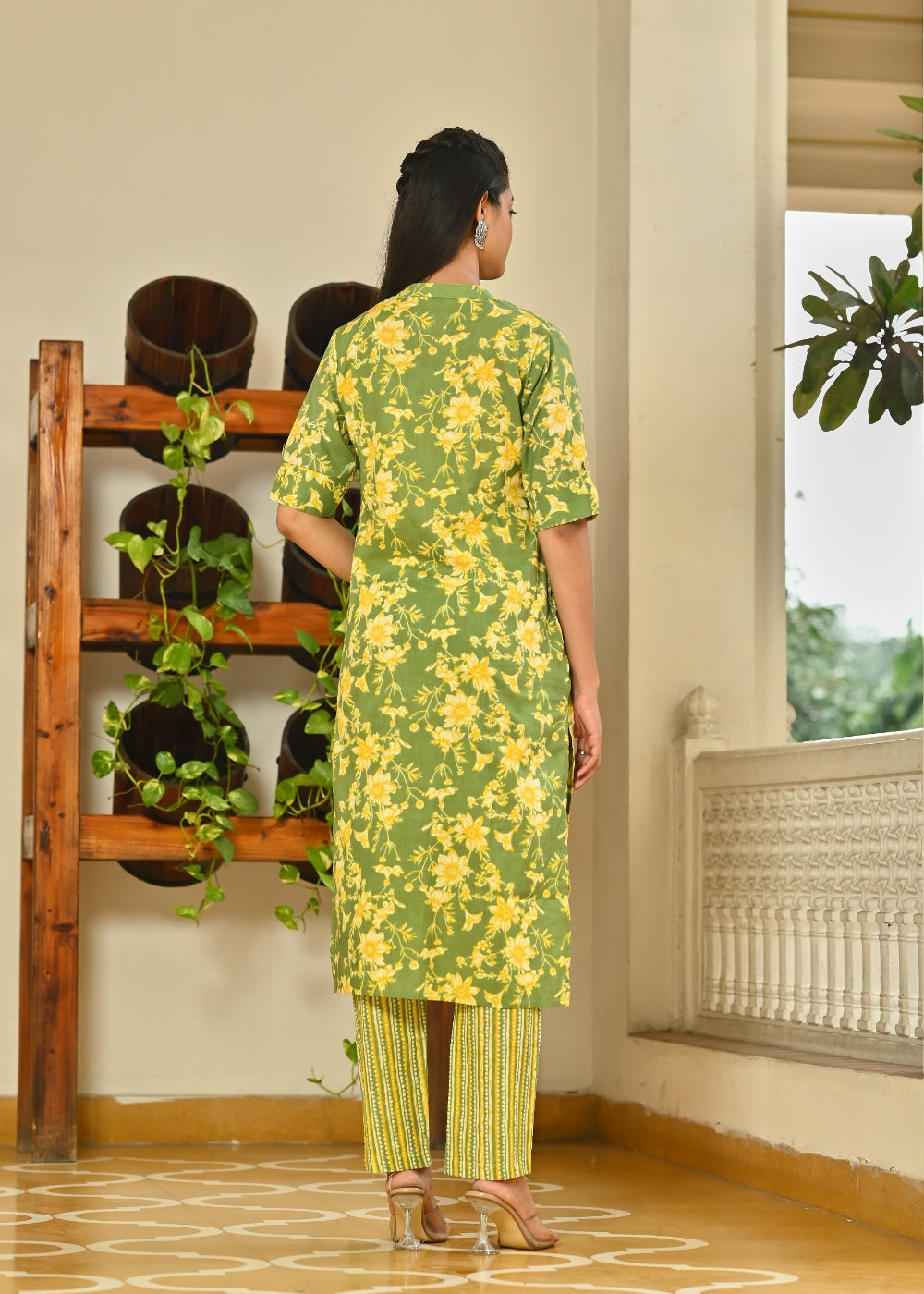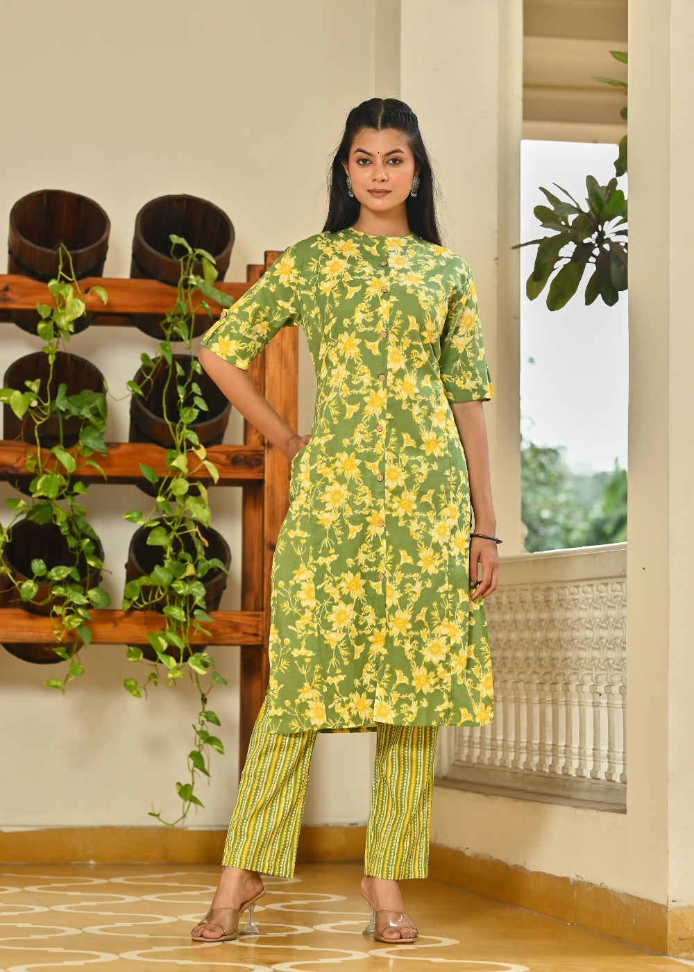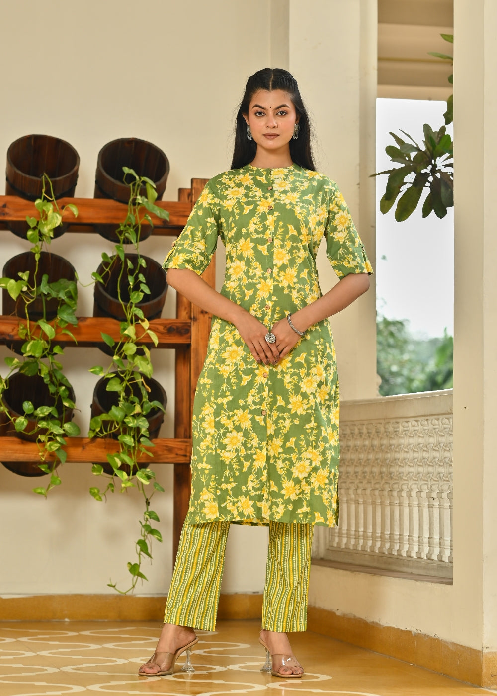 Refresh your ethnic wardrobe with this green floral cotton kurta set, designed for comfort and charm. The kurta features a yellow floral print over a leafy green base, giving it a fresh and lively vibe. Its straight-cut silhouette, button-down front, and three-quarter sleeves make it a stylish yet versatile pick.
