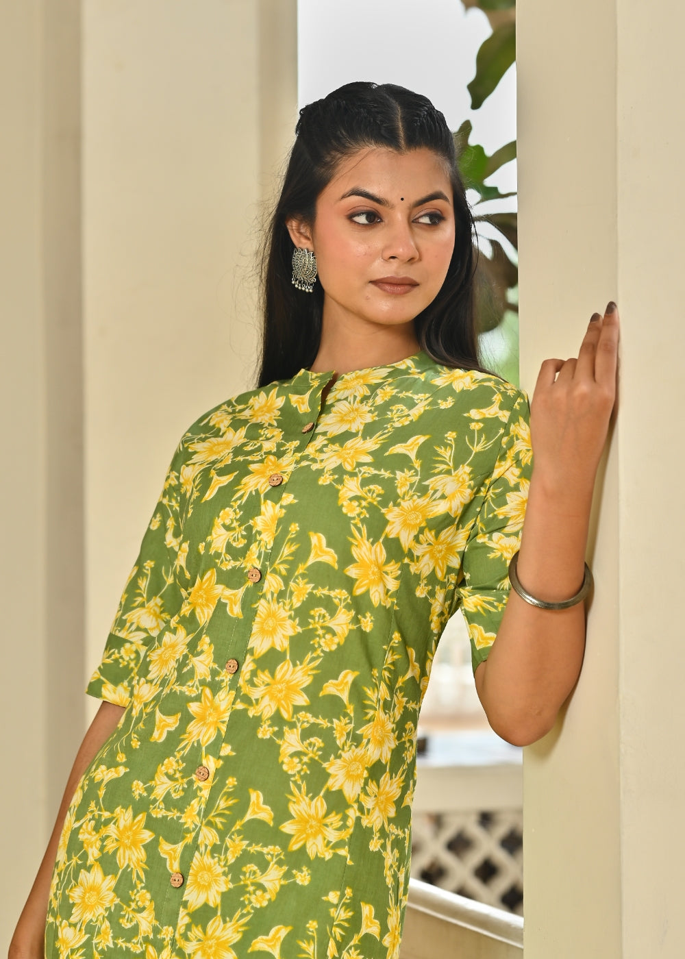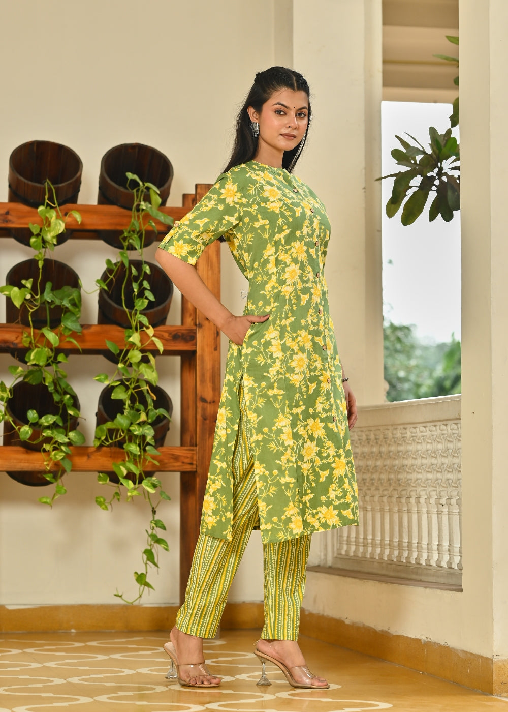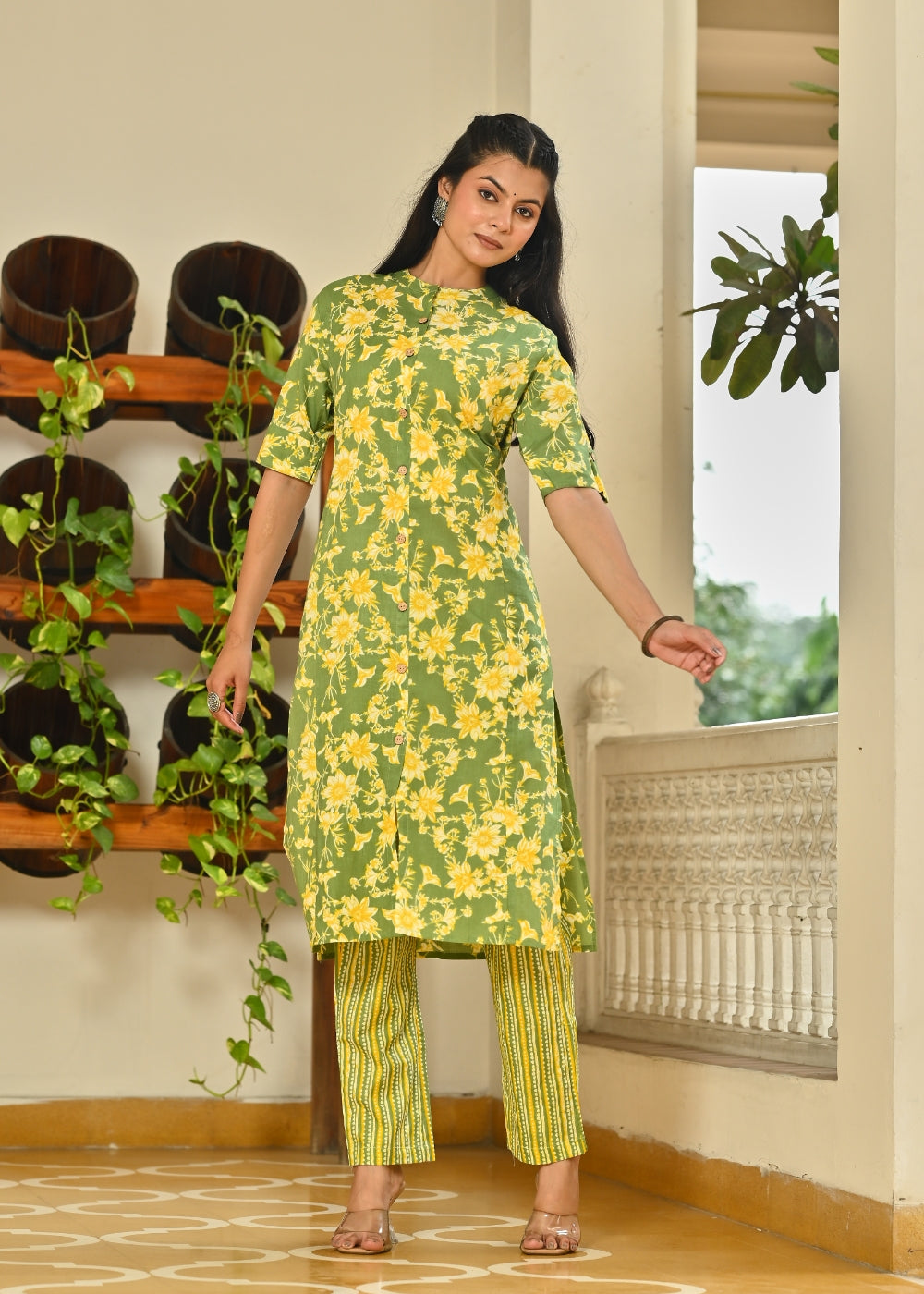 Refresh your ethnic wardrobe with this green floral cotton kurta set, designed for comfort and charm. The kurta features a yellow floral print over a leafy green base, giving it a fresh and lively vibe. Its straight-cut silhouette, button-down front, and three-quarter sleeves make it a stylish yet versatile pick.