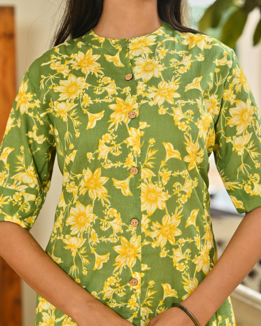 - 🌼 Design: Green base with yellow floral print & front buttons