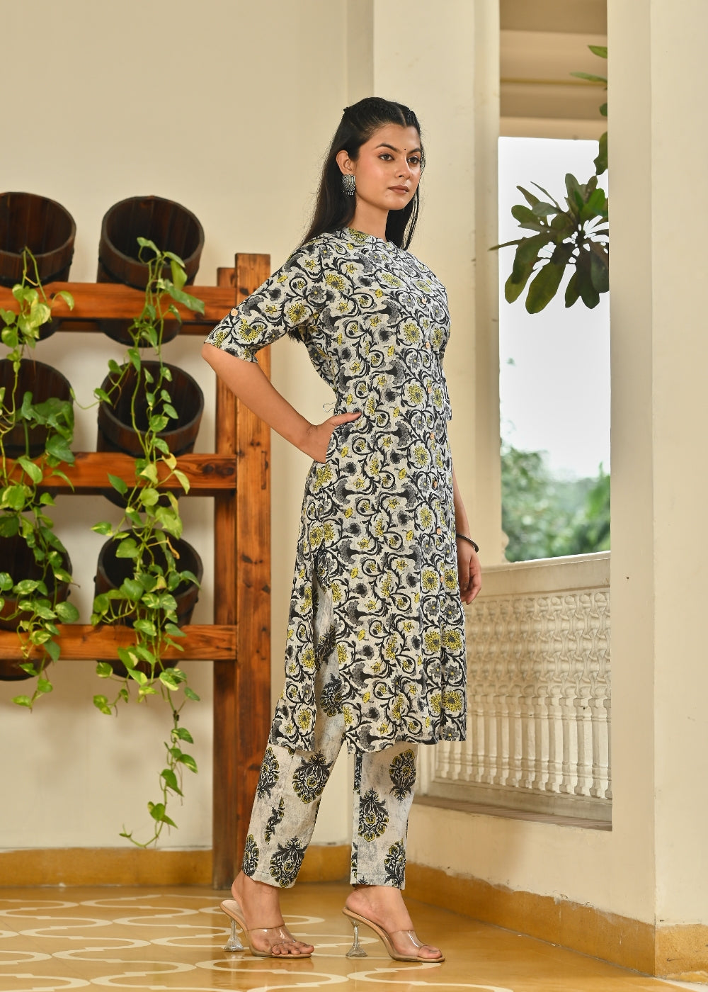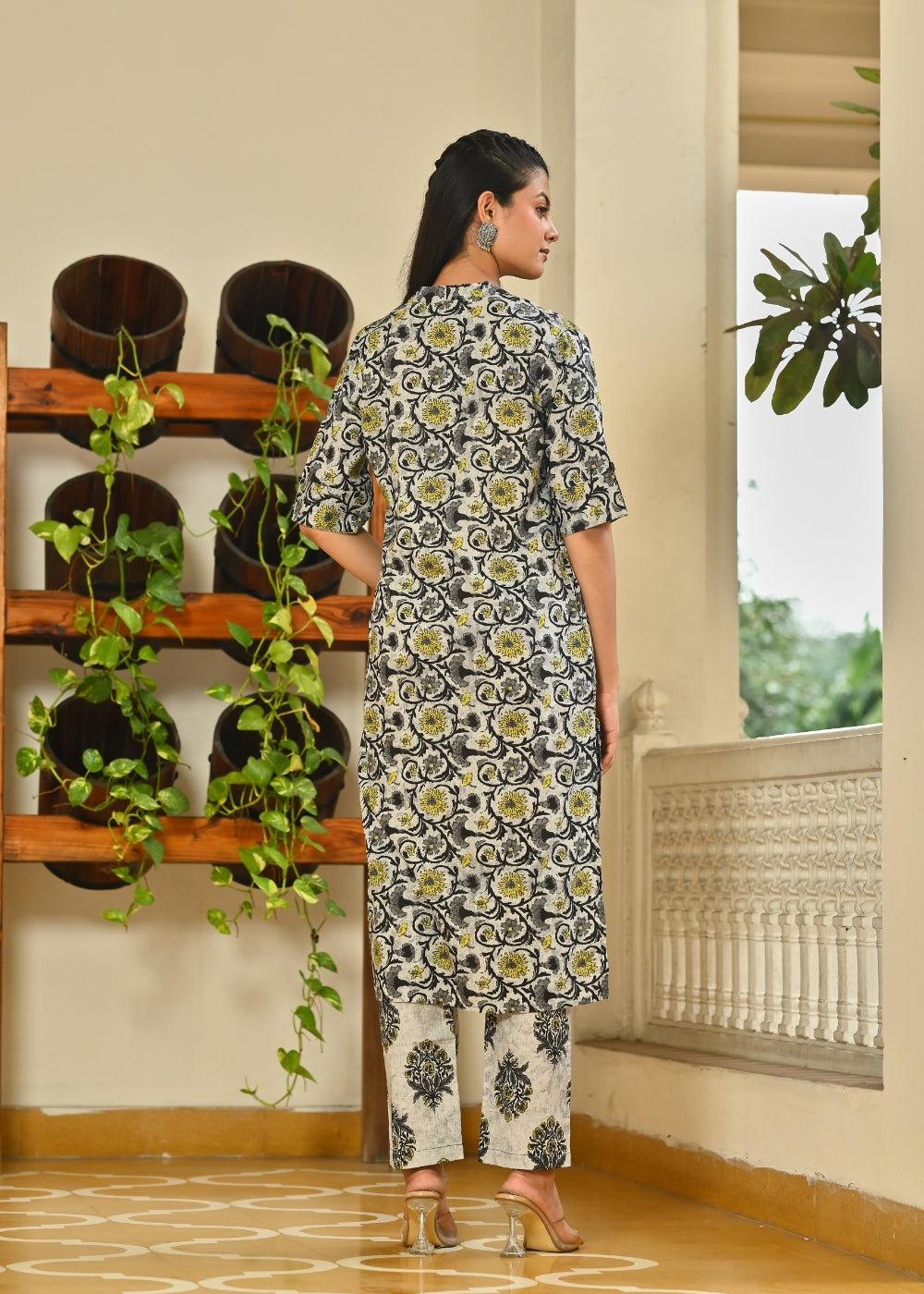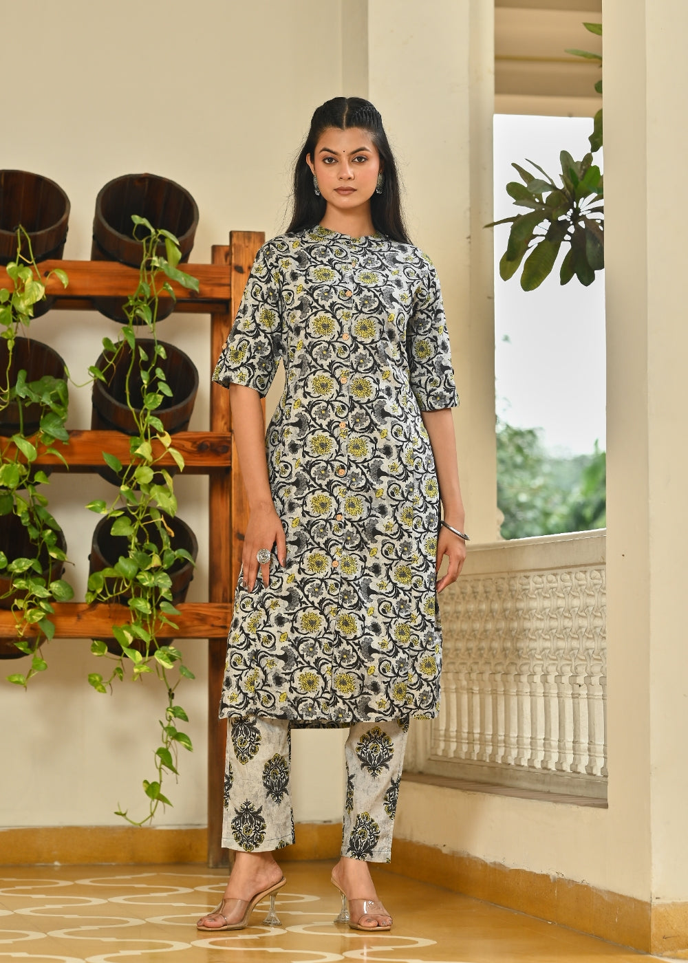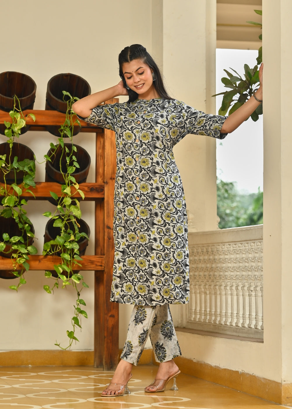 Add a touch of sophistication to your ethnic wardrobe with this grey floral cotton kurta set. Featuring a striking grey base with yellow floral motifs, this kurta is designed with a straight silhouette and three-quarter sleeves for a timeless appeal.