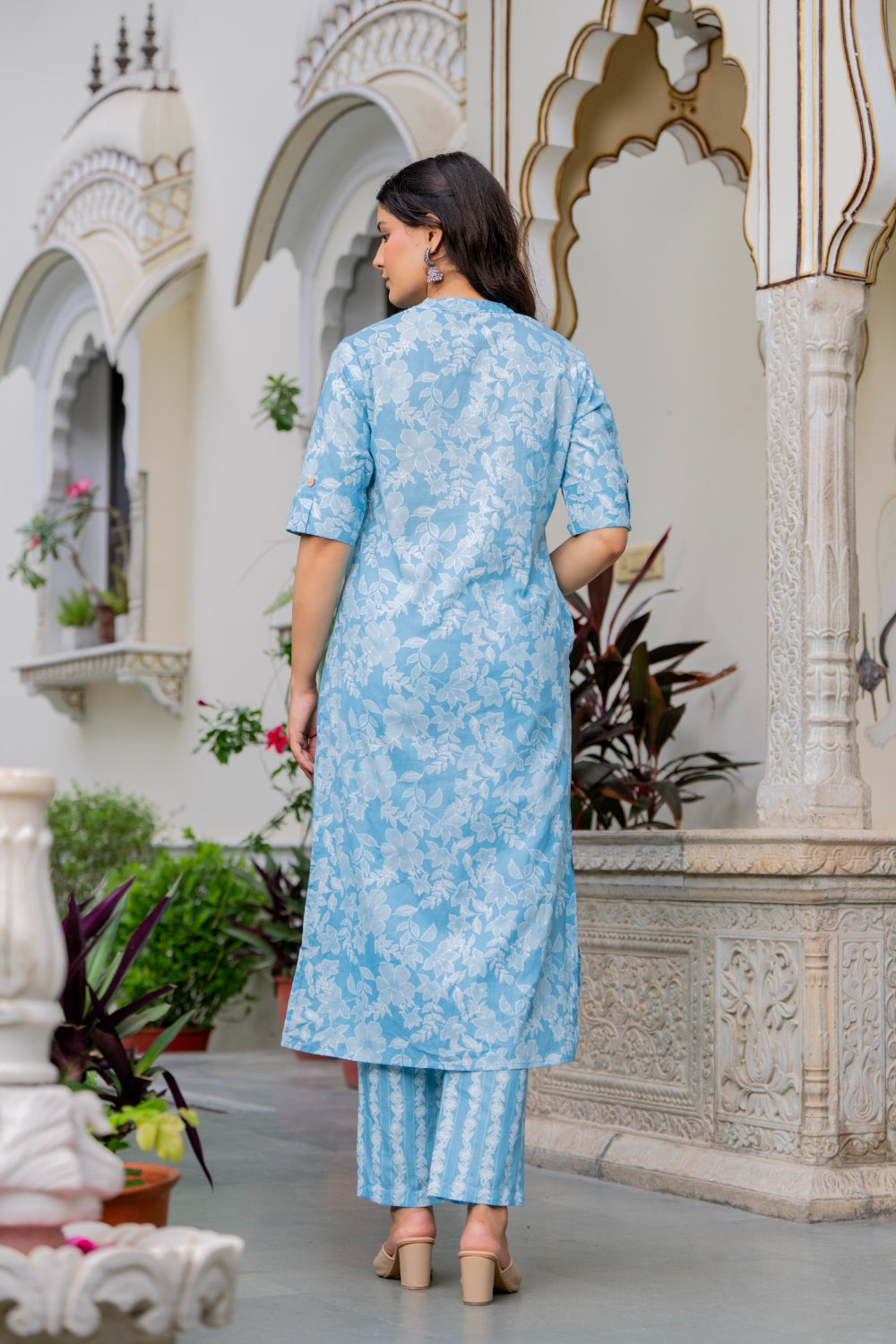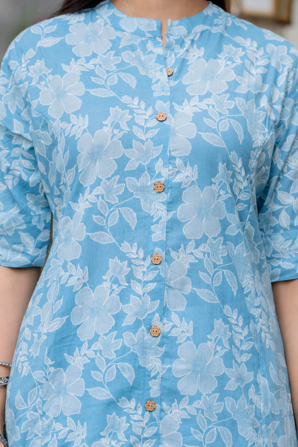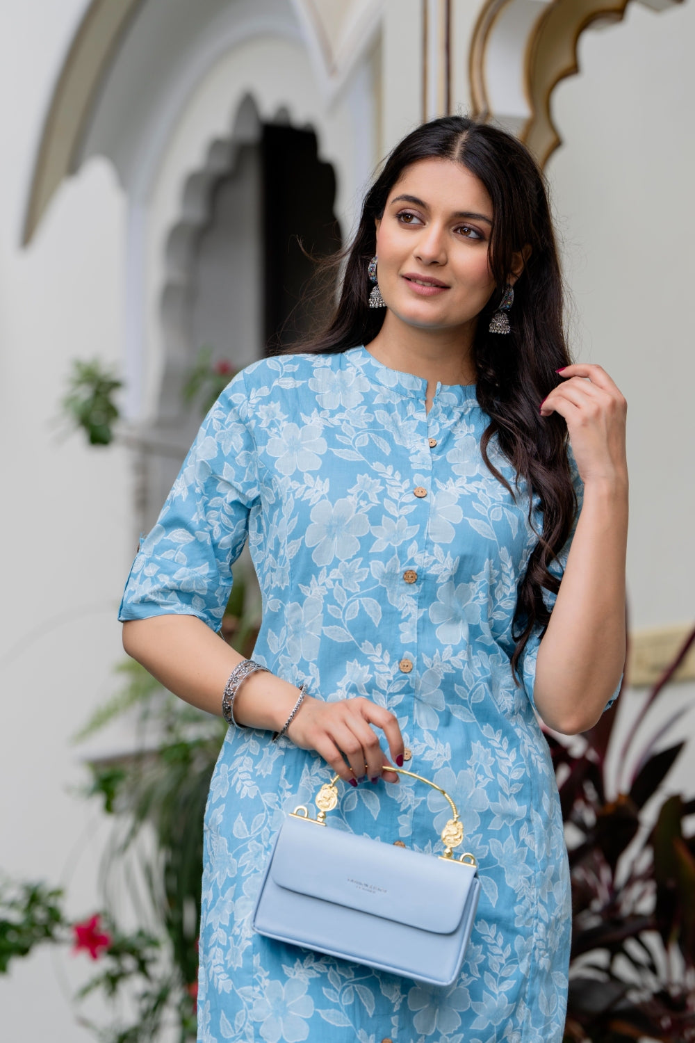 Bring timeless elegance to your wardrobe with this light blue floral cotton kurta set, crafted to combine comfort and sophistication. Featuring a subtle all-over white floral print on a serene blue base, the kurta exudes grace and charm. Its straight-fit design, button-down front, and three-quarter sleeves make it a versatile choice for any occasion.