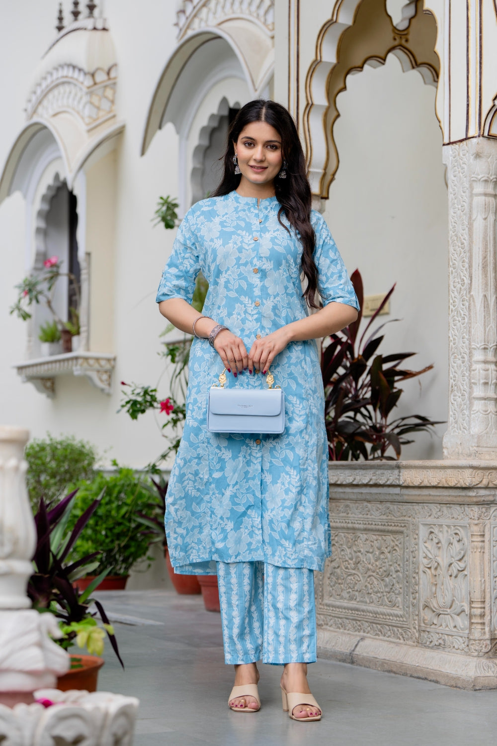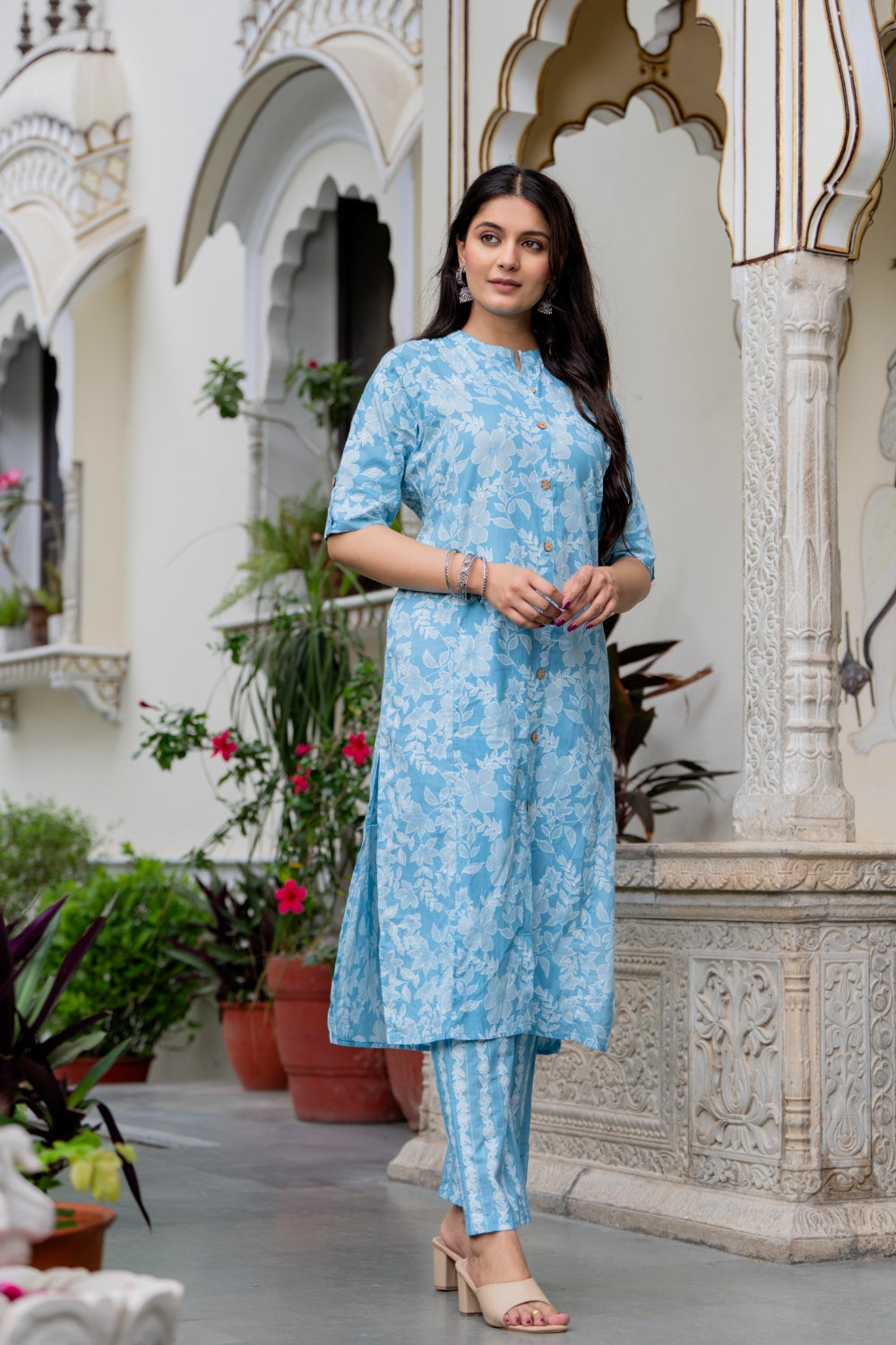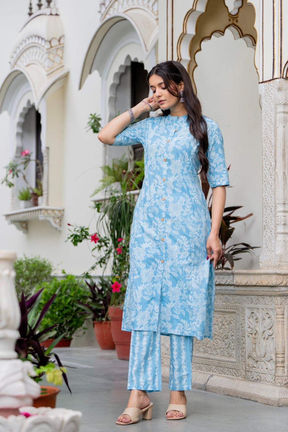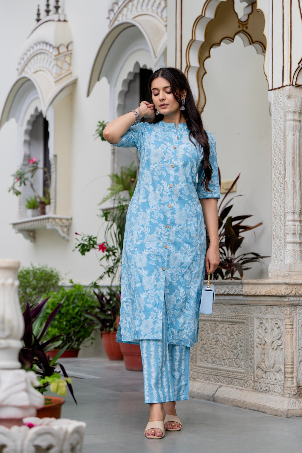 Bring timeless elegance to your wardrobe with this light blue floral cotton kurta set, crafted to combine comfort and sophistication. Featuring a subtle all-over white floral print on a serene blue base, the kurta exudes grace and charm. Its straight-fit design, button-down front, and three-quarter sleeves make it a versatile choice for any occasion.