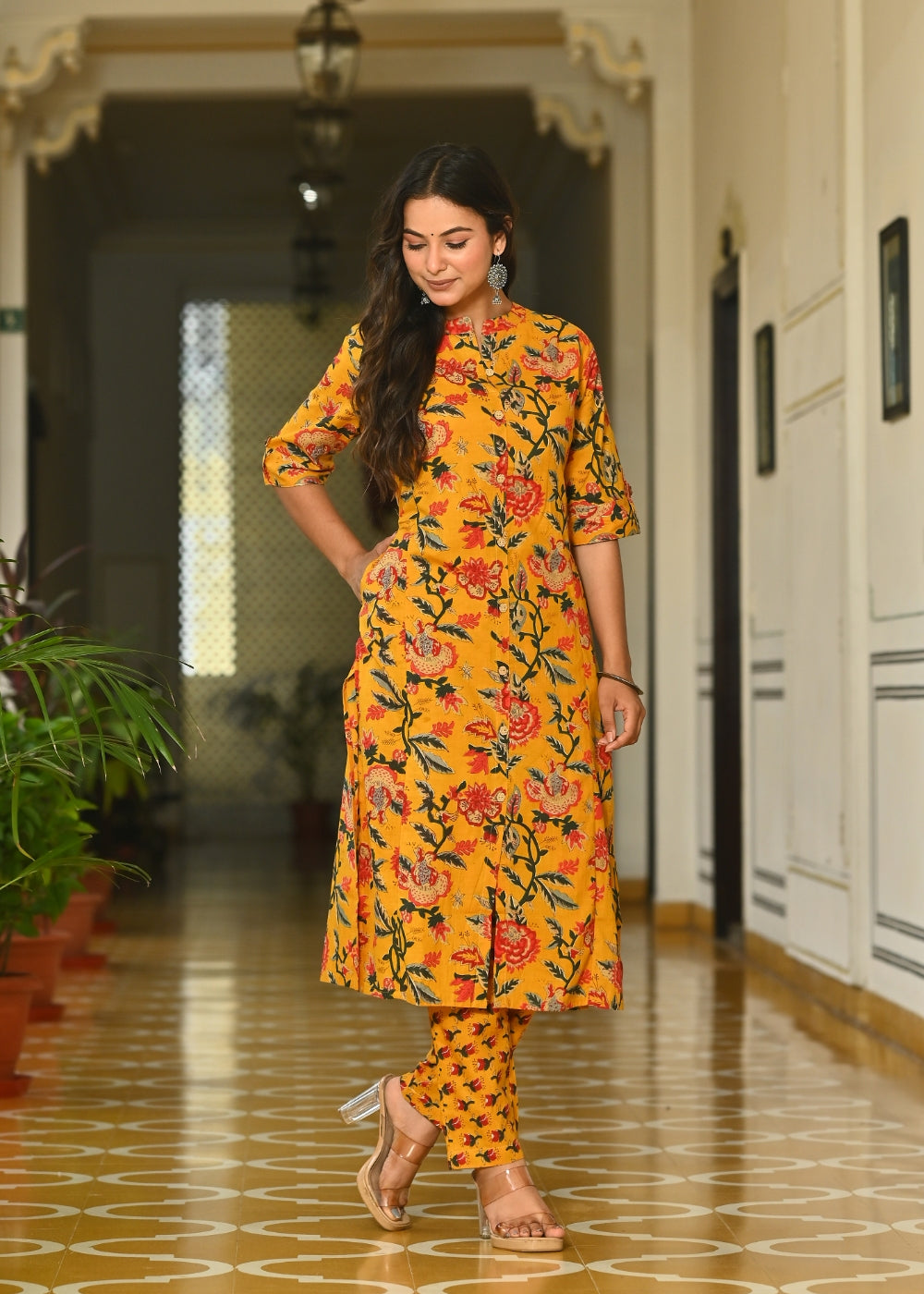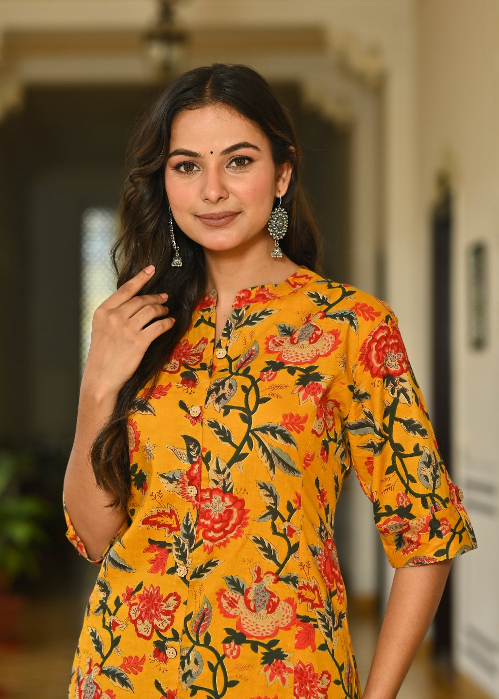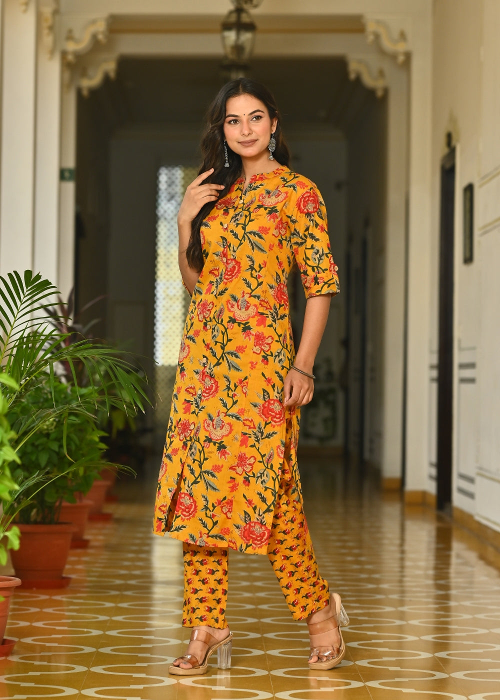Bring sunshine to your wardrobe with this mustard yellow floral cotton kurta set, designed to add a splash of elegance and vibrance to your everyday style. Made from soft, breathable cotton fabric, this kurta showcases a bold multi-colored floral print that blends tradition with modern flair.