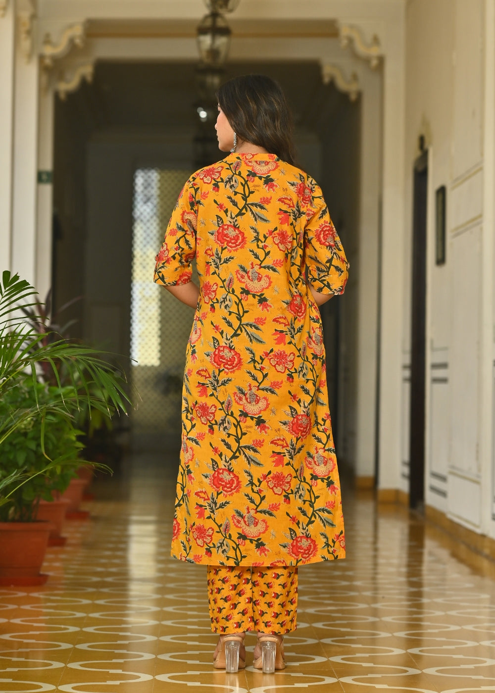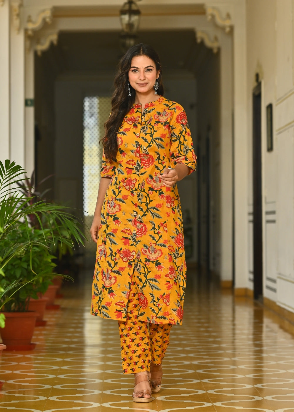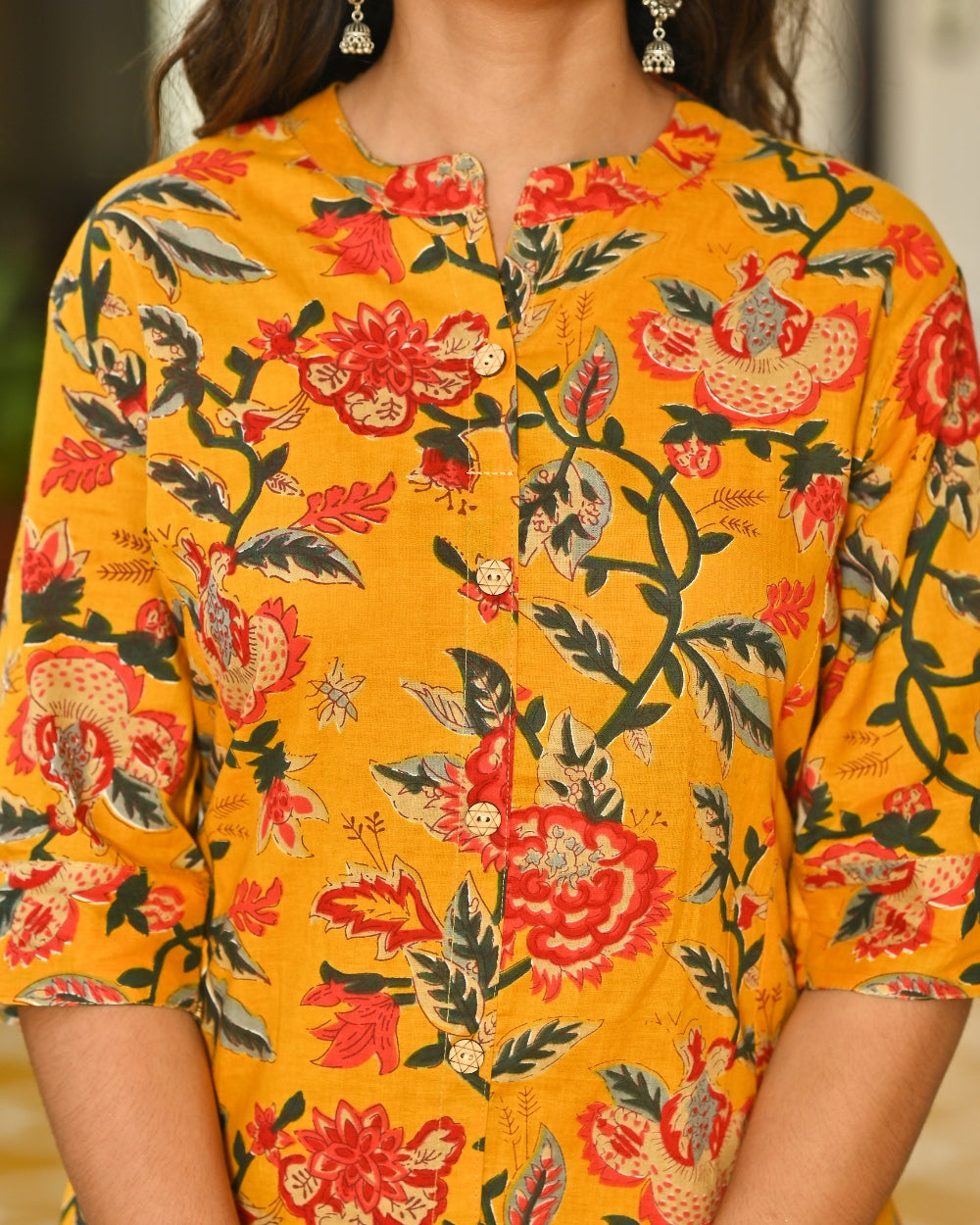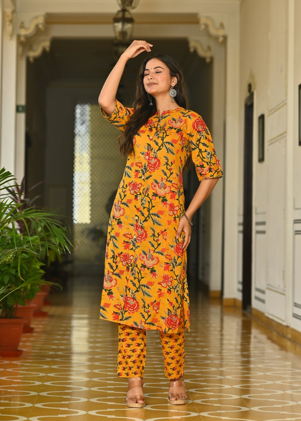 Bring sunshine to your wardrobe with this mustard yellow floral cotton kurta set, designed to add a splash of elegance and vibrance to your everyday style. Made from soft, breathable cotton fabric, this kurta showcases a bold multi-colored floral print that blends tradition with modern flair.